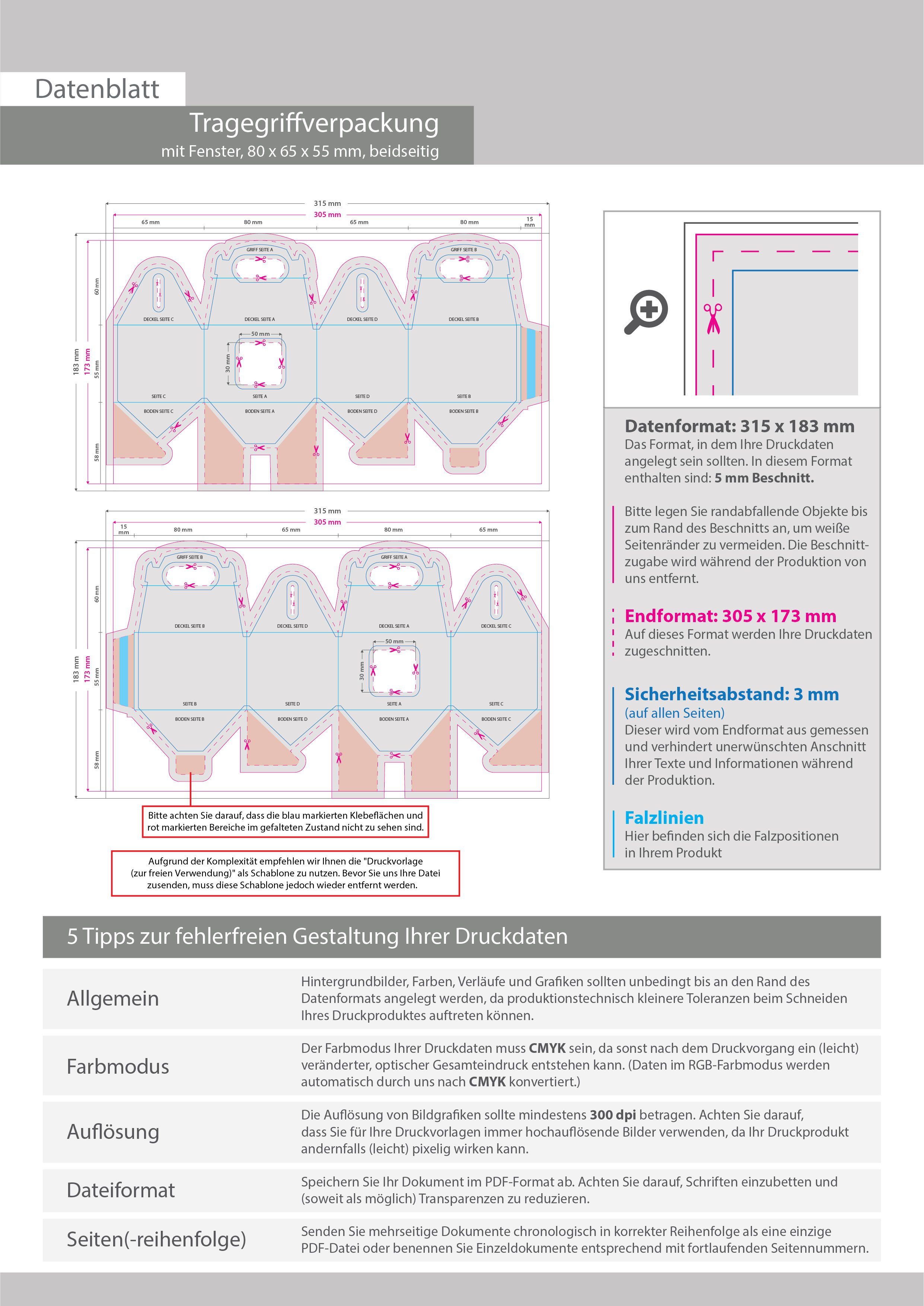 Tragegriffverpackung (8 cm x 6,5 cm x 5,5 cm) beidseitig bedruckt 4/4-farbig mit gestanztem Fenster