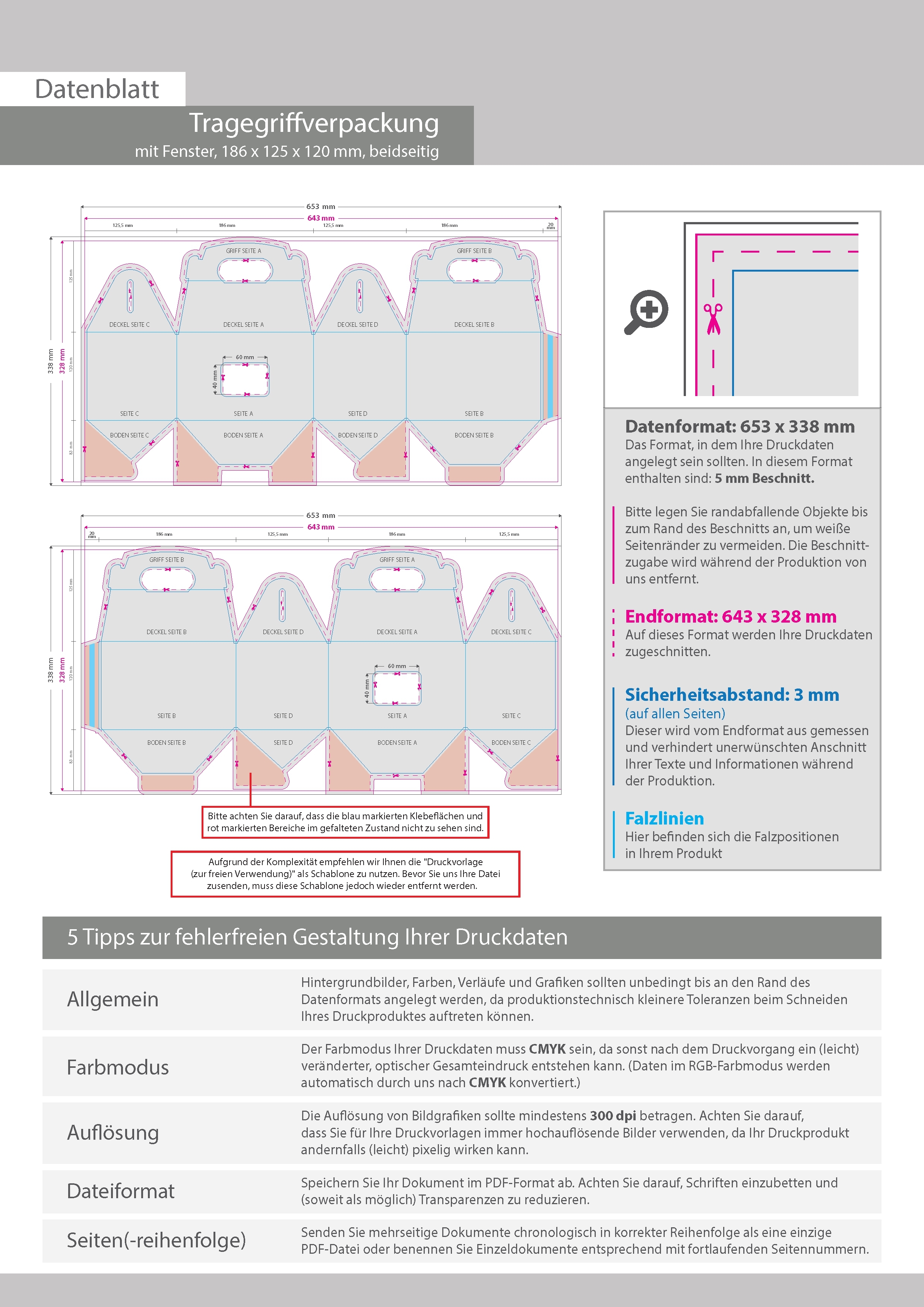 Tragegriffverpackung (18,6 cm x 12,5 cm x 12 cm) beidseitig bedruckt 4/4-farbig mit gestanztem Fenster