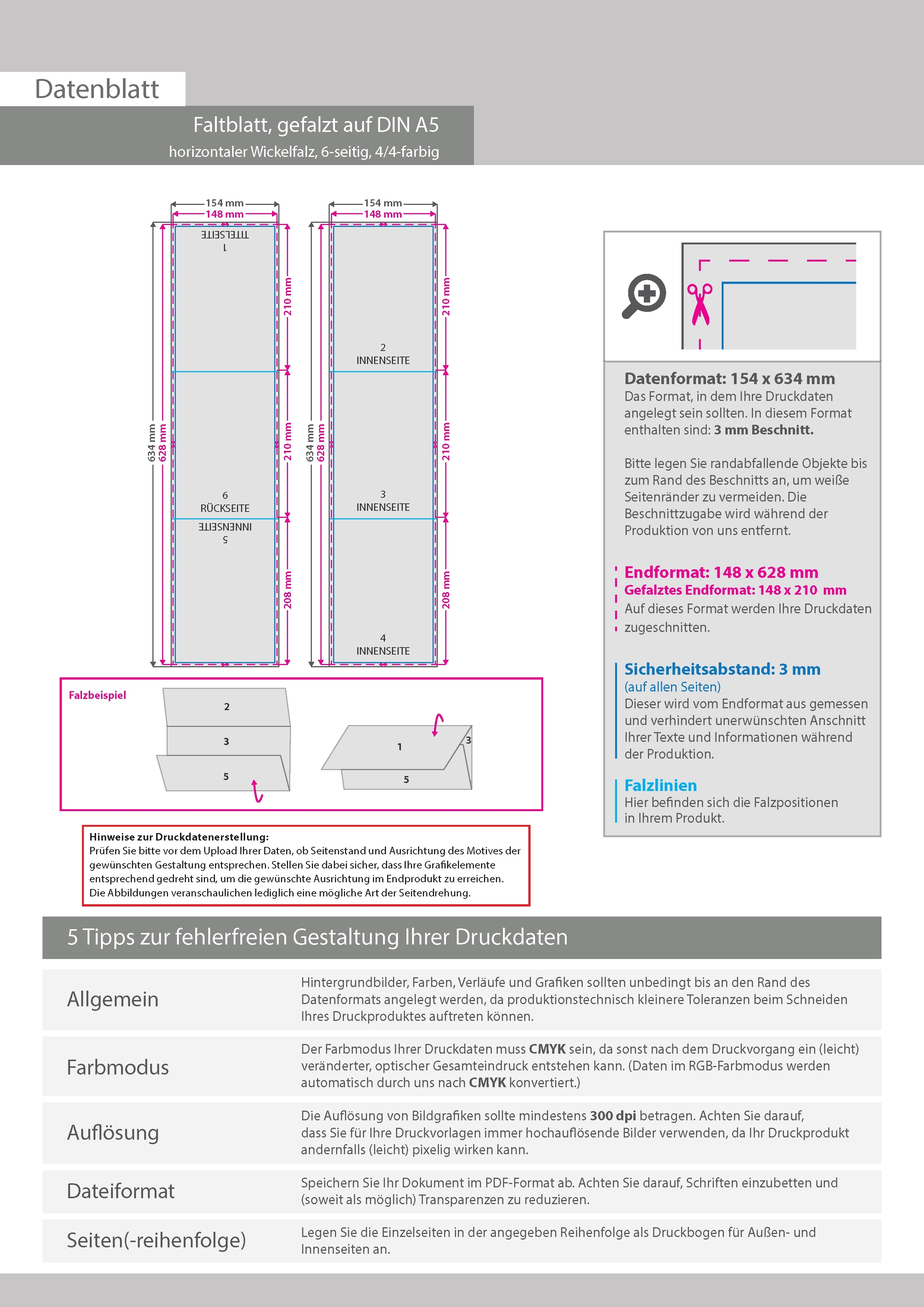 Faltblatt, gefalzt auf DIN A5, horizontaler Wickelfalz, 6-seitig