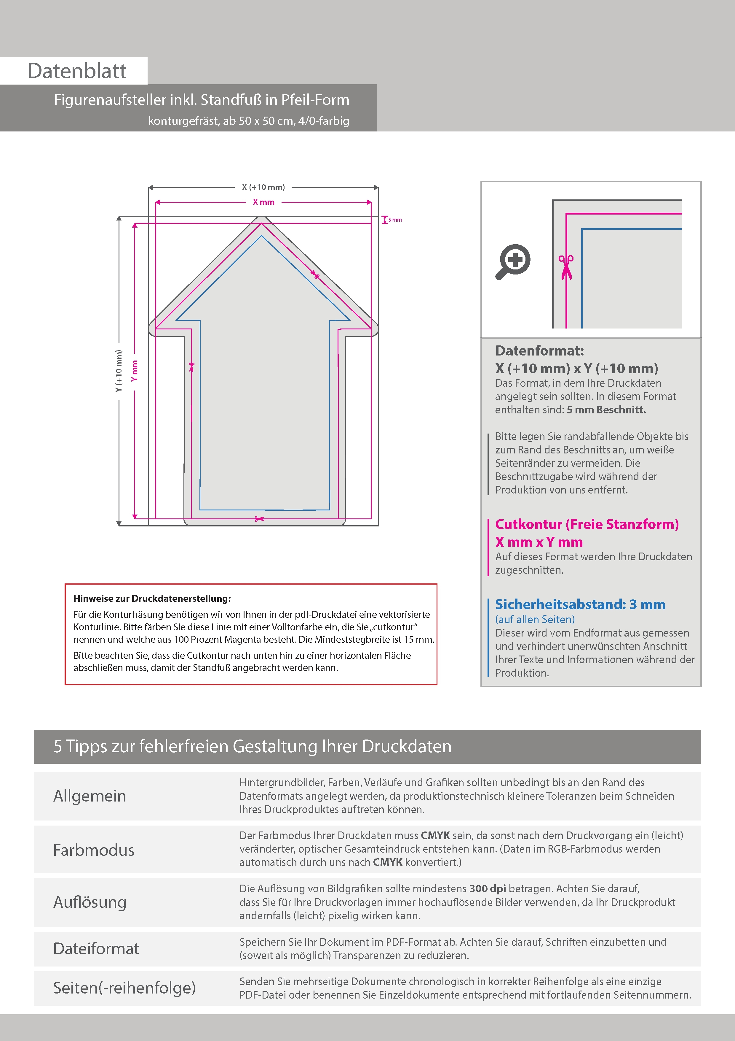 Figurenaufsteller inkl. Standfuß in Pfeil-Form konturgefräst, einseitig 4/0-farbig bedruckt