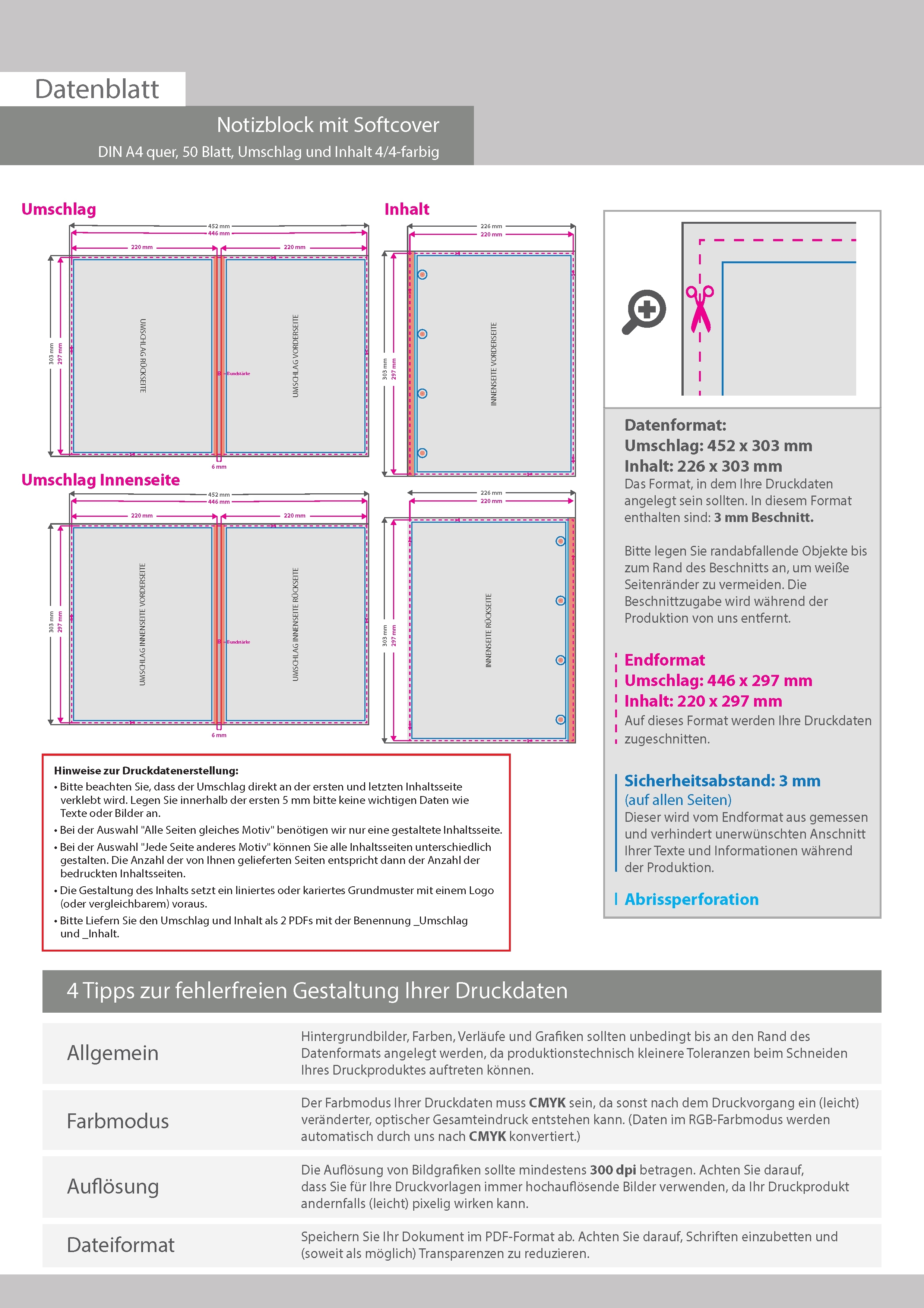 Block mit Softcover, DIN A4 quer, 50 Blatt, Umschlag und Inhalt 4/4-farbig CMYK beidseitig bedruckt
