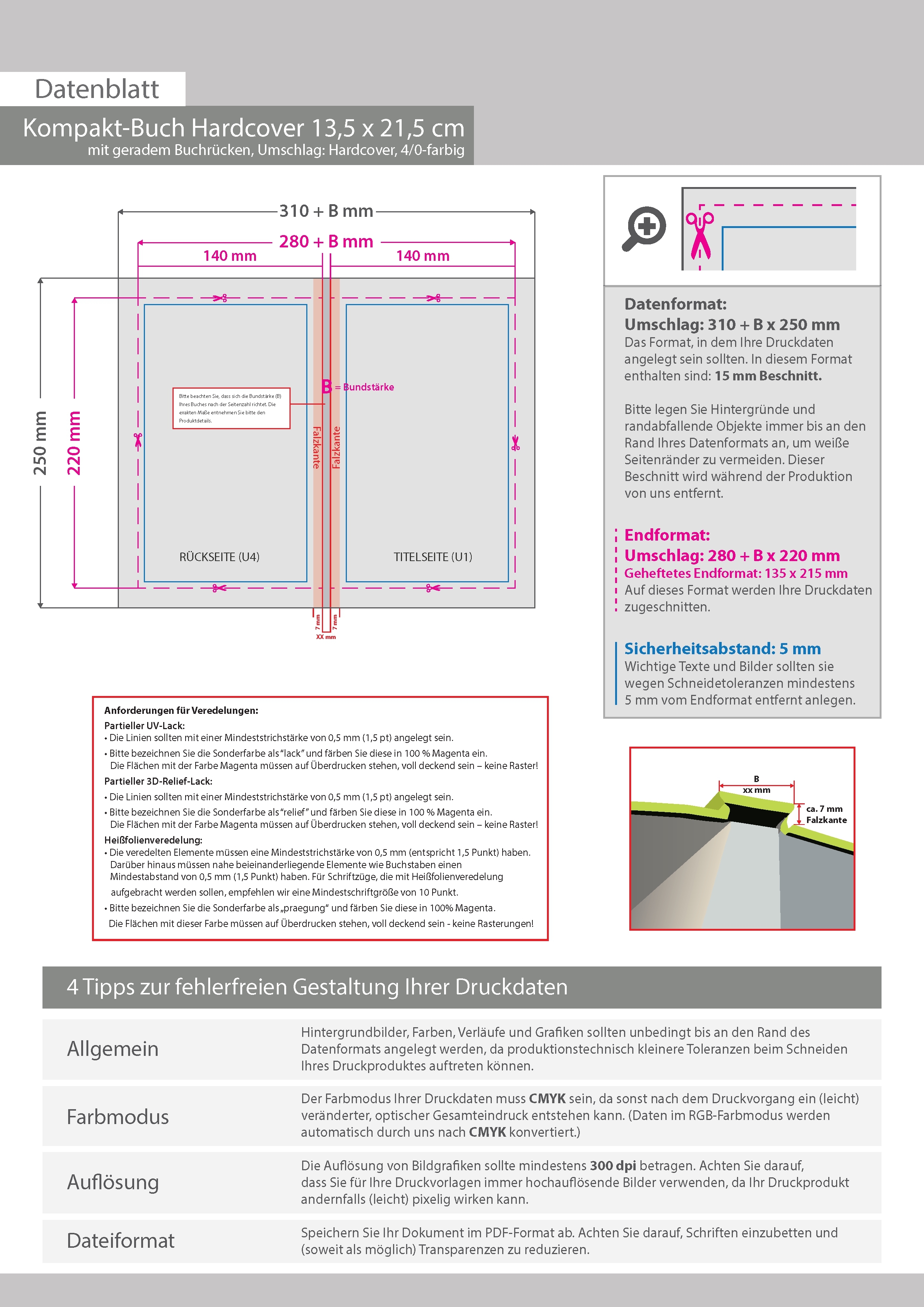 Kompakt-Buch Hardcover mit geradem Rücken, 13,5 x 21,5 cm hoch, Umschlag 4/0-farbig CMYK, Inhalt 264 Seiten 1/1-farbig Schwarz