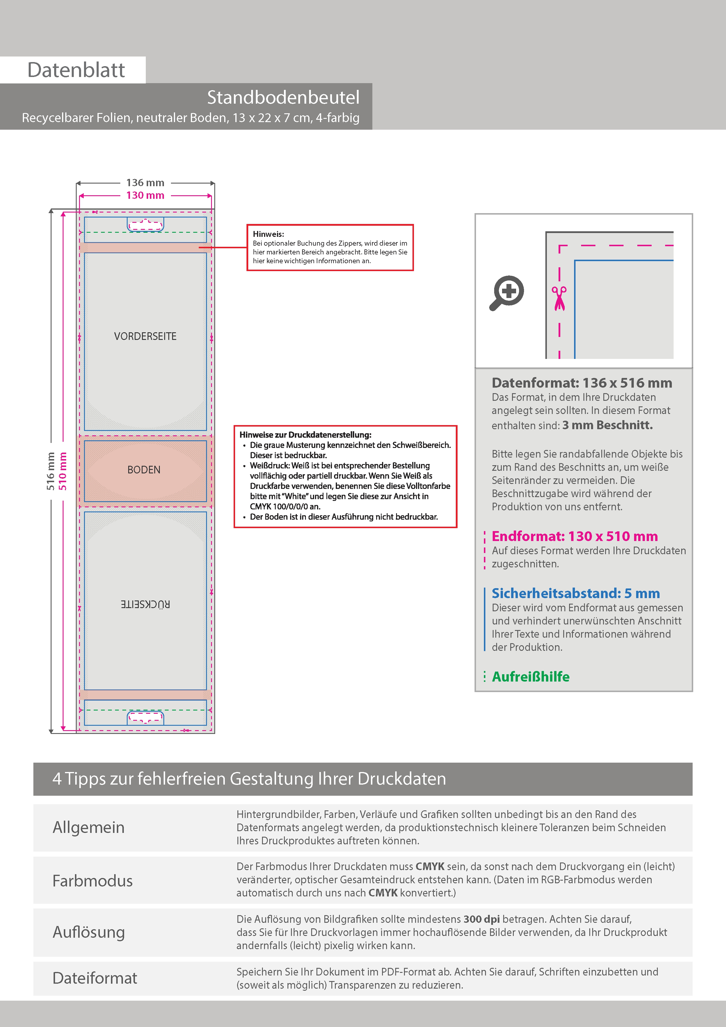 Recycelbarer Folien-Standbodenbeutel 13 x 22 x 7 cm mit neutralem Boden, 4-farbig bedruckt