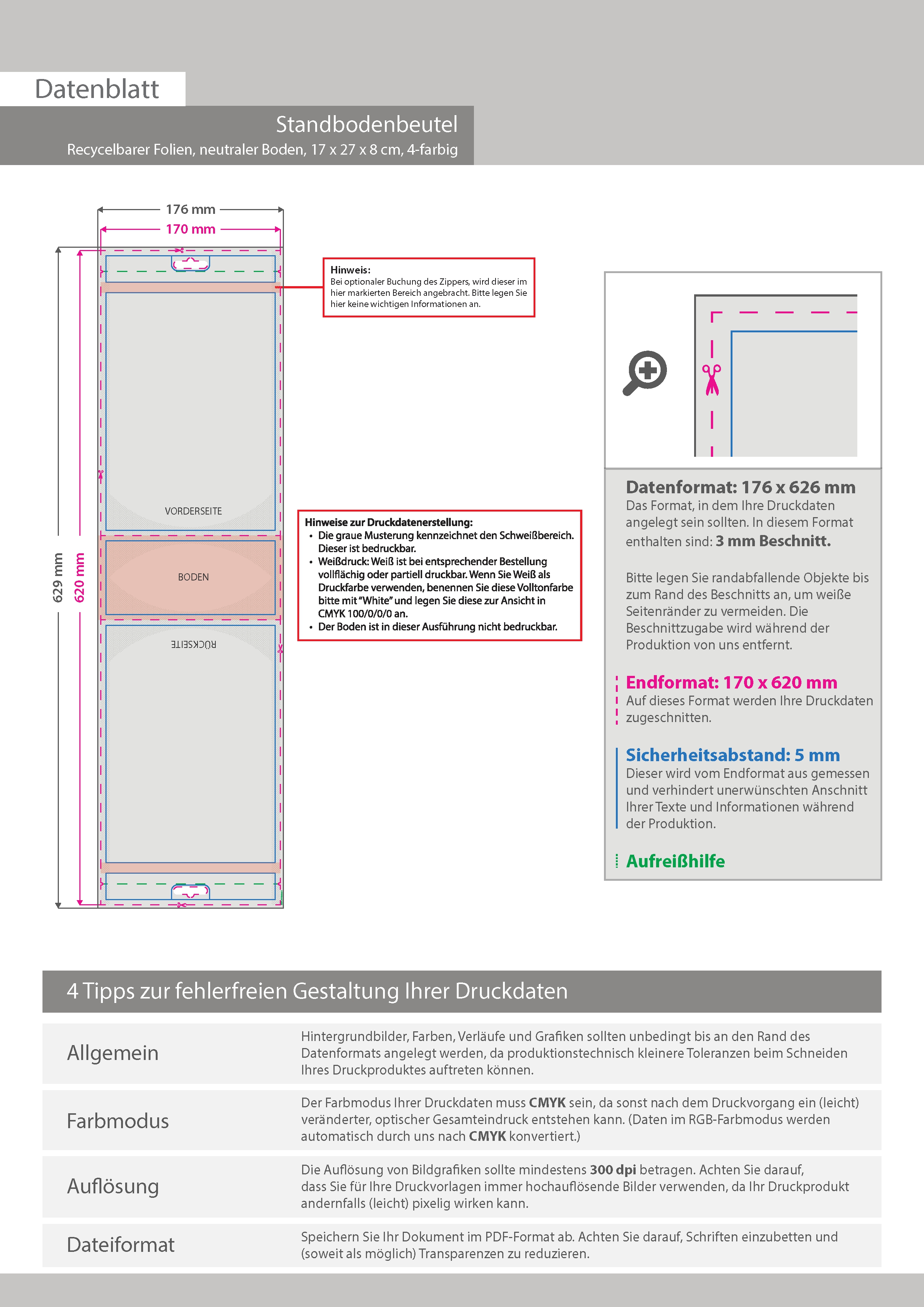 Recycelbarer Folien-Standbodenbeutel 17 x 27 x 8 cm mit neutralem Boden, 4-farbig bedruckt