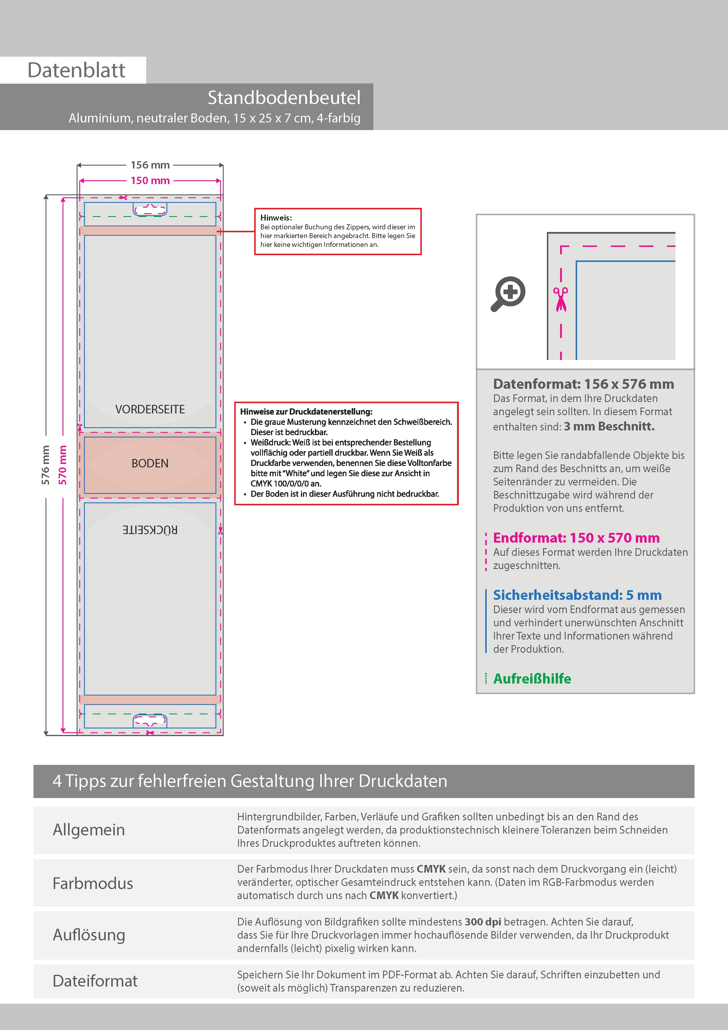 Aluminium-Standbodenbeutel 15 x 25 x 7 cm mit neutralem Boden, 4-farbig bedruckt